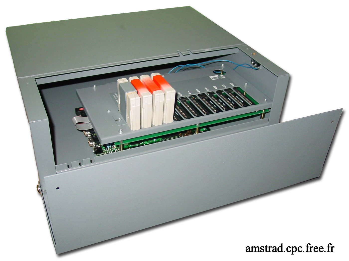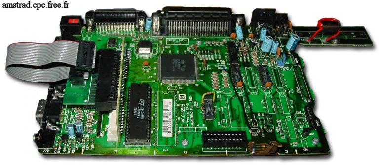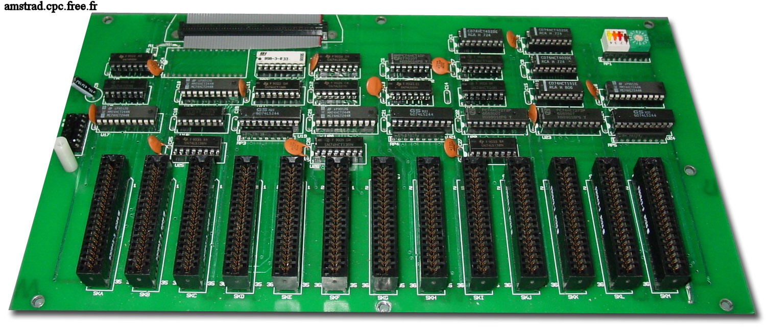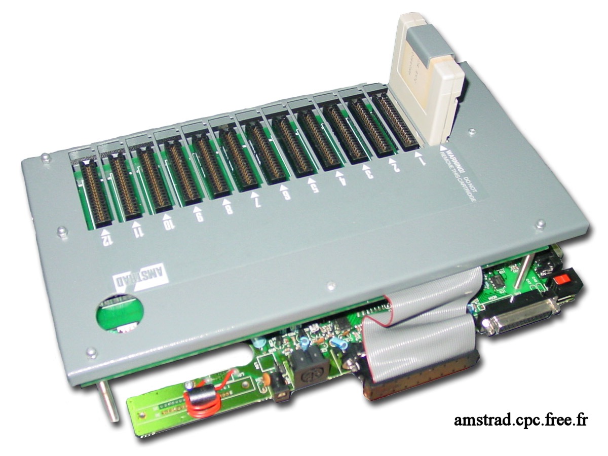 On remarque que les deux cartes sont marquées “Issue No 2”, étant certainement liées. La plus petite vient s’enficher dans le slot cartouche classique du CPC+. Sur cette carte, un petit connecteur d’où sort une nappe elle même reliée à la carte fille contenant les autres slots cartouches. On voit sur la photo de la carte mère la petite carte enfichée dans le slot, avec sa nappe. La carte mère étant celle d’un CPC 464+ classique, j’ai ainsi pu la mettre dans une caisse de 464+ et le mettre en route sans aucun soucis.