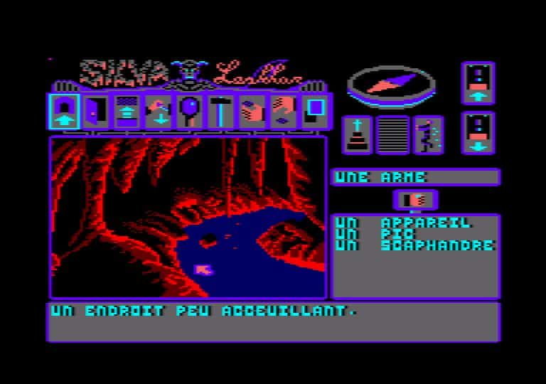 Il est vrai que très peu de jeux utilisaient le curseur d’une souris (dirigé par le clavier) comme interface. Cela a été d’ailleurs l’un des premiers programmes conçus. La volonté de faire aussi bien que les “grands” était bel et bien réelle. Il fallait donc des icônes, une interaction directement sur l’image, quelques animations et pourquoi pas une séquence d’arcade au sein du jeu d’aventure.