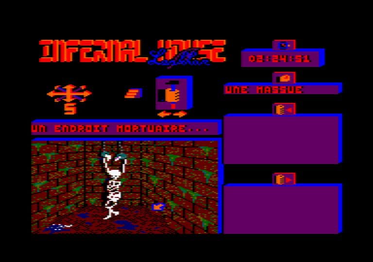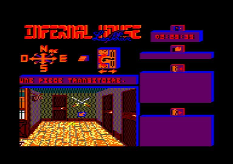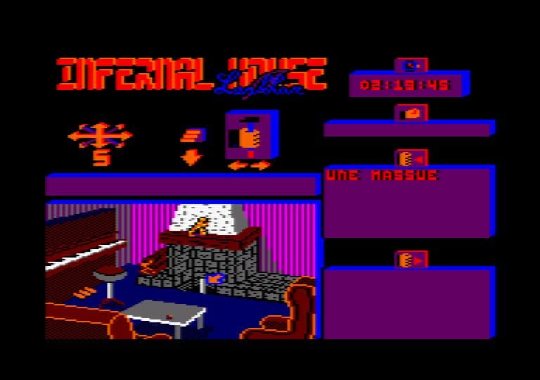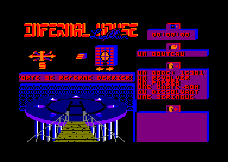 De mémoire, une de ces musiques provient du registre classique (une modeste adaptation de la Sonate au Clair de Lune de Beethoven), quant aux autres, elles sont pures compositions. La musique d’introduction d’Infernal House provient à l’origine d’un essai de programme hasardeux. En effet, je faisais des expériences sur le coprocesseur sonore de l’Amstrad (Yamaha AY3-8912 – 3 voix) et je me suis rendu compte qu’en produisant la même note sur les trois voix, mais avec une fréquence légèrement décalée, on obtenait un surprenant effet surround. Avec ce procédé, il ne restait plus qu’à composer la séquence de note unique créant l’ambiance lugubre et donnant ainsi toute l’ampleur de la musique d’introduction d’Infernal House.