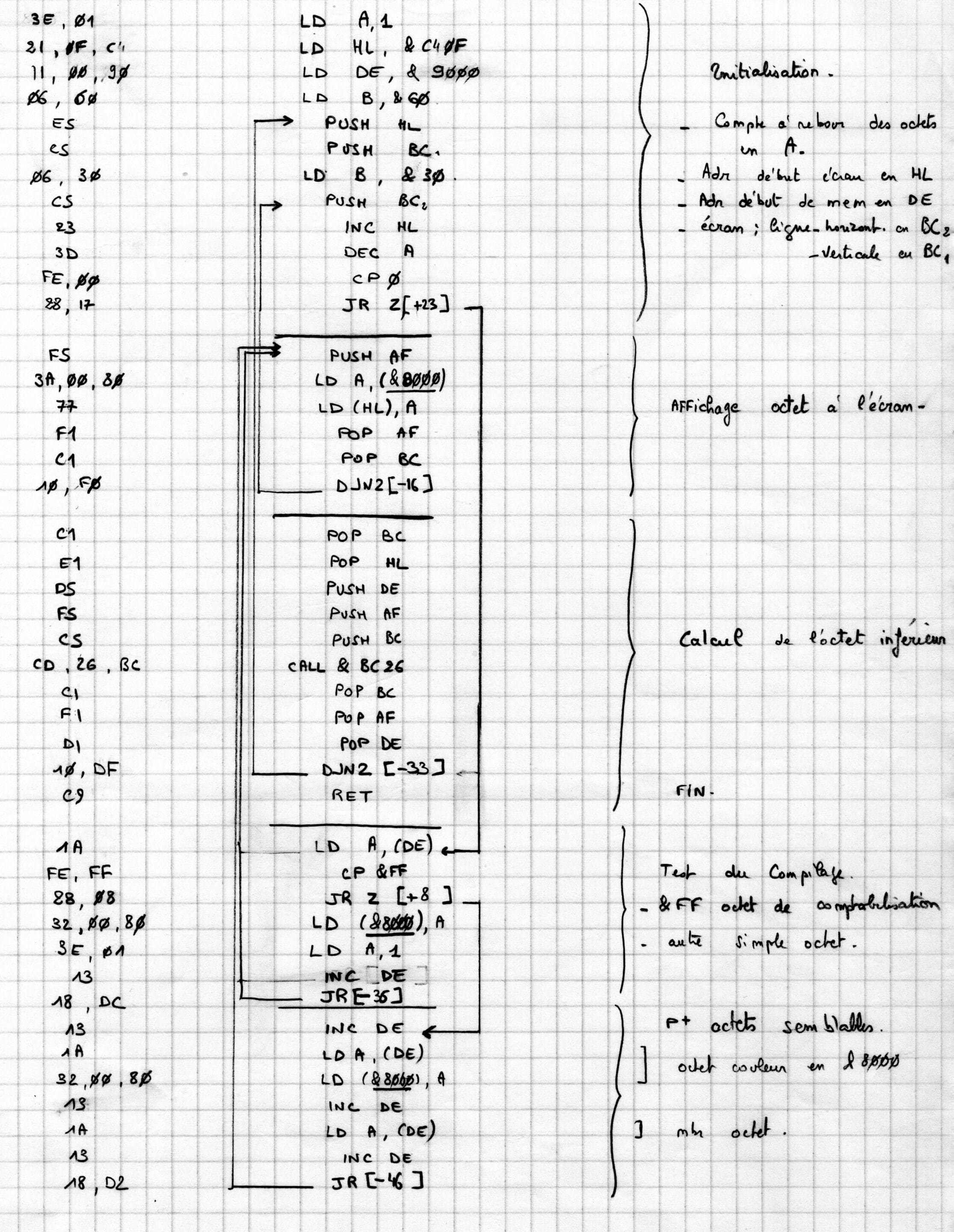 Dans ce programme, nous en étions à calculer le nombre de NOP (No Operation) nécessaires et à les placer judicieusement dans le code afin de réaliser une sorte de pause pour afficher surnaturellement l’ensemble des couleurs dans une image “haute résolution” (en mode 2, soit 640×200 !) et sans aucun parasite. Régulièrement, Laurent me montrait ses toutes dernières démos basées principalement sur la gestion 3D (sur un TO7 tout de même !). D’ailleurs, aux dernières nouvelles, il travaille sur l’optimisation de moteur 3D utilisés par les grands studios actuels.