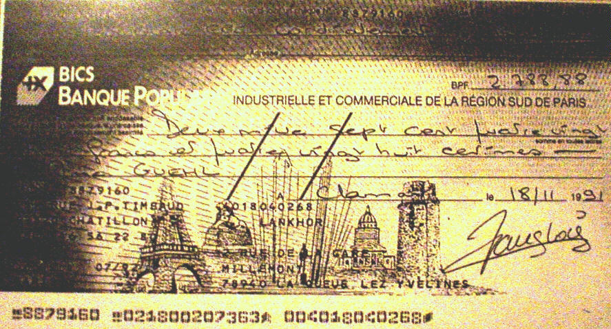 Le premier chèque de ma vie (j’en ai fait une photocopie et elle est toujours au dessus de mon bureau, dans un cadre), me fut donc versé par Béatrice Langlois de chez Lankhor, d’un montant très exact de (tu vas rire) 2788,88 FF (oui, et 88 centimes, c’est important). Cela représente 2500 FF pour l’achat du jeu La TVA que Lankhor me devait – l’inscription a la SACEM etc.