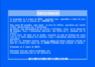 1 MODE 1:INK 0,11:a$=”AZERTYUIOP^* 789QSDFGHJKLM|# 456WXCVBN?./=$0 123″:FOR l=0 TO 2:FOR c=1 TO 16:LOCATE 3+c*2+l,8+l*3:PRINT MID$(a$,c+l*16,1):NEXT c,l:t=TIME+17980:WHILE TIME<t:v=20:t$=” “:WHILE t$=” “:t$=MID$(a$,1+RND*48,1):p=INSTR(a$,t$):WEND:WHILE v