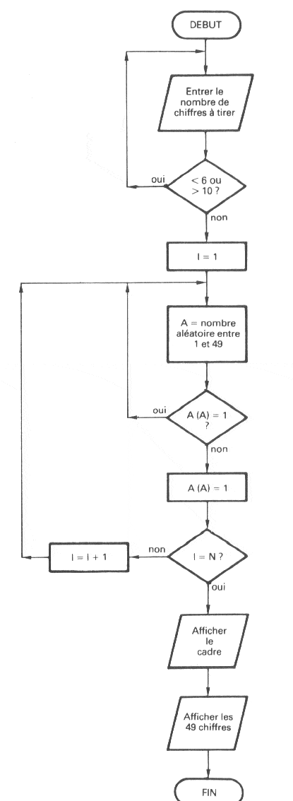 Après le dimensionnement du tableau A(), on saisit au clavier le nombre de chiffres que l’on veut obtenir (6 pour les grilles simples, 7 à 10 pour les multiples)