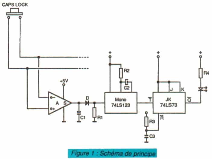 Les impulsions ainsi mises en forme actionnent une simple bascule JK. Le voyant (une DEL de diamètre 3 mm implantée clans la touche CAPS LOCK) est directement actionne par la sortie Q de la bascule.