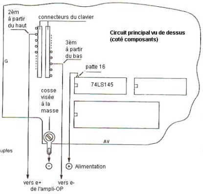 Un amplificateur opérationnel compare les deux tensions présentes aux bornes de la touche considérée. Un petit filtrage élimine les micro impulsions générées par ENTER, (entre autres touches). Ceci commande un monostable redéclenchable (d’autres anti-rebond a base de 7400 n’ayant pas donné satisfaction) éliminant les rebonds et les impulsions dues aux lectures du clavier par l’unité centrale.
